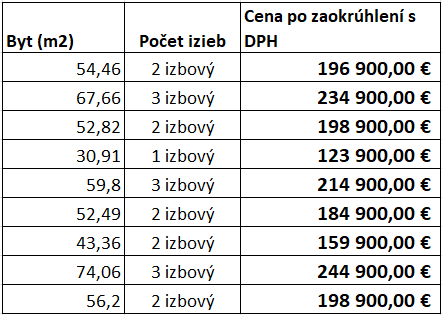 | Zatriedenie | Byt (m2) | Počet izieb | Predzáhrada (m2) | Balkón/terasa (m2) | Kobka (m2) | Cena po zaokrúhlení s DPH | Poznámka |